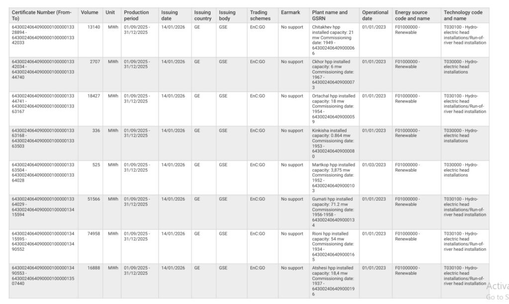 “EP Georgia Supply” Discloses Certificates of Origin for Electricity generated from Renewable Energy Sources for the Entire Month of July 2025