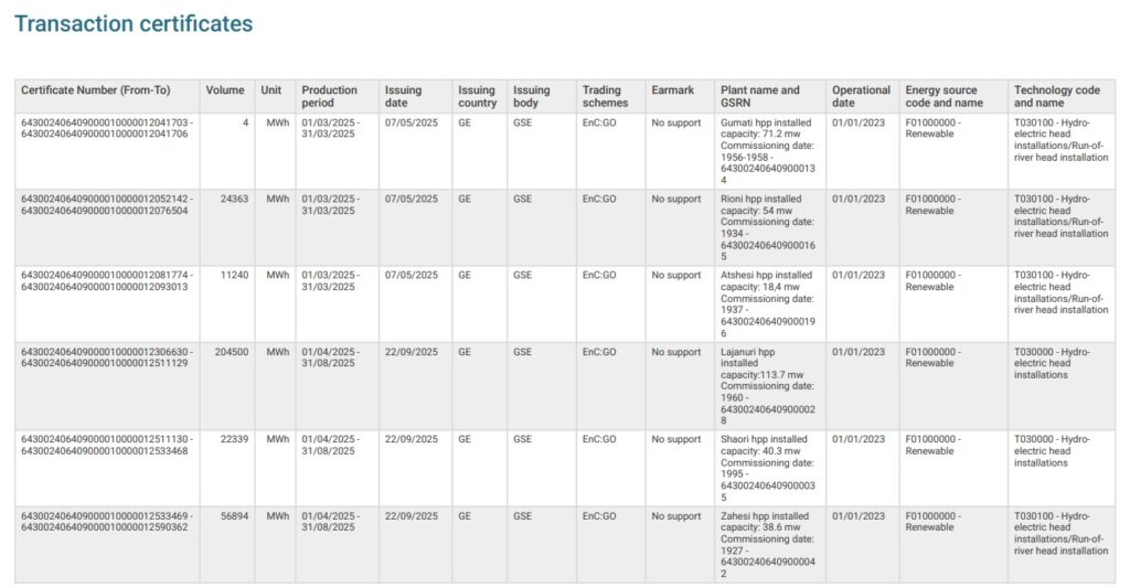 ეპ ჯორჯია მიწოდებამ სექტემბრის თვის სრულ მოხმარებაზე განახლებადი ენერგიის წყაროებიდან წარმოებული ელექტროენერგიის წარმოშობის სერტიფიკატები გაამჟღავნა.